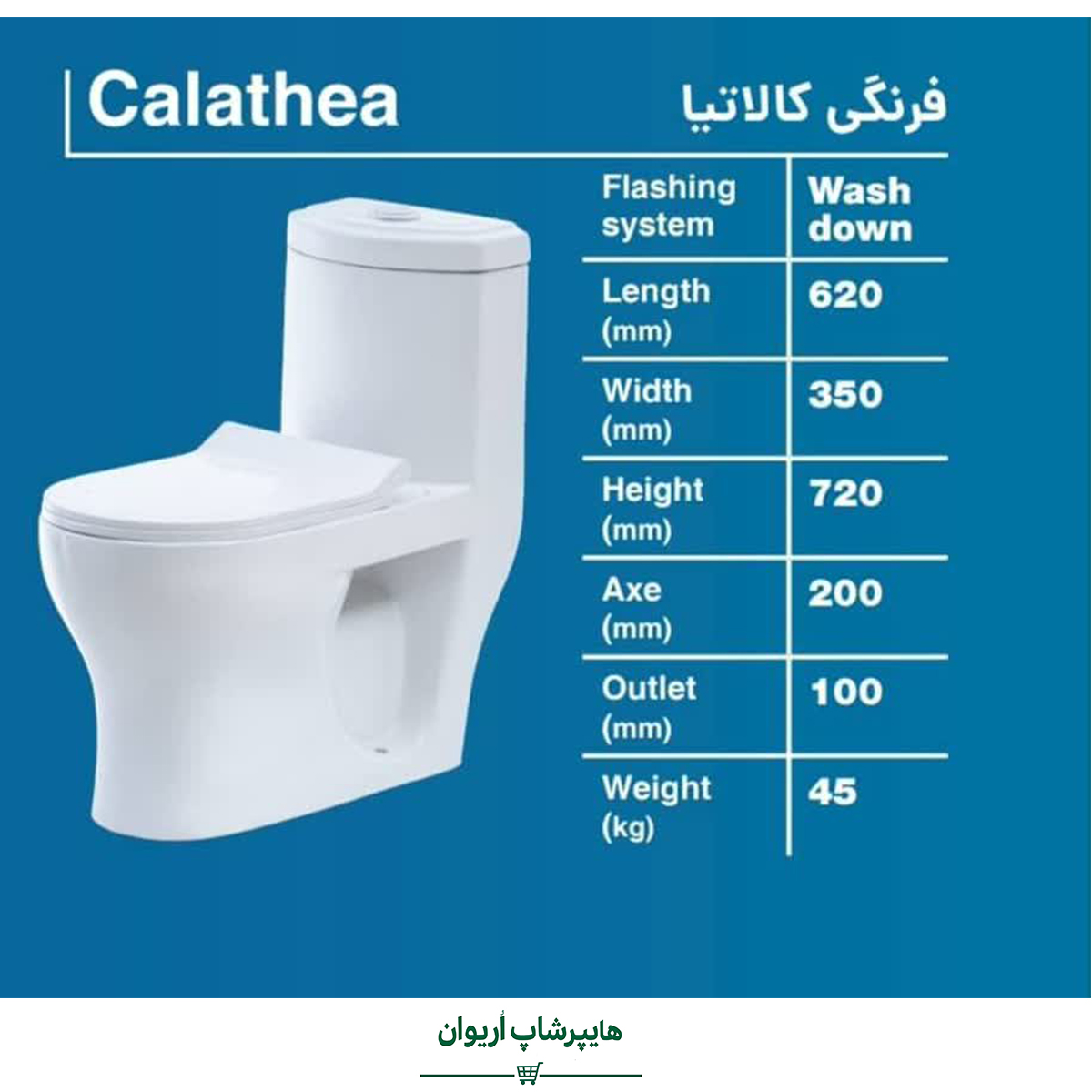 خرید توالت فرنگی ایساتیس مدل کالاتیا از هایپر شاپ اریوان — طراحی مدرن، لعاب باکیفیت، سیستم تخلیه دو زمانه و مصرف بهینه آب.