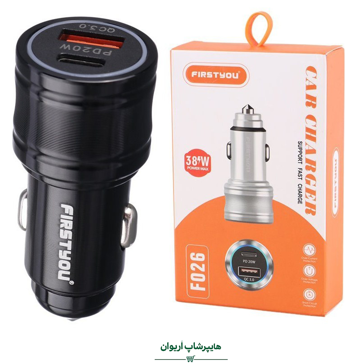 خرید شارژر فندکی فست شارژ Firstyou مدل F026 با توان 20 وات از هایپر شاپ اریوان. مجهز به فناوری QC3.0 و PD، شارژ سریع و ایمن با بدنه فلزی مقاوم و طراحی حرفه‌ای.