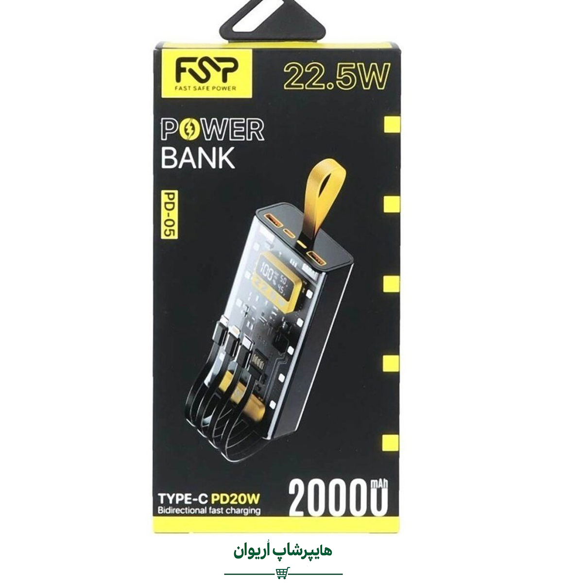 خرید پاور بانک 20000 FSP مدل PD-05 از هایپر شاپ اریوان. پشتیبانی از شارژ سریع PD و QC3.0، سه پورت خروجی، ظرفیت واقعی، طراحی مقاوم و سیستم ایمنی چندگانه.